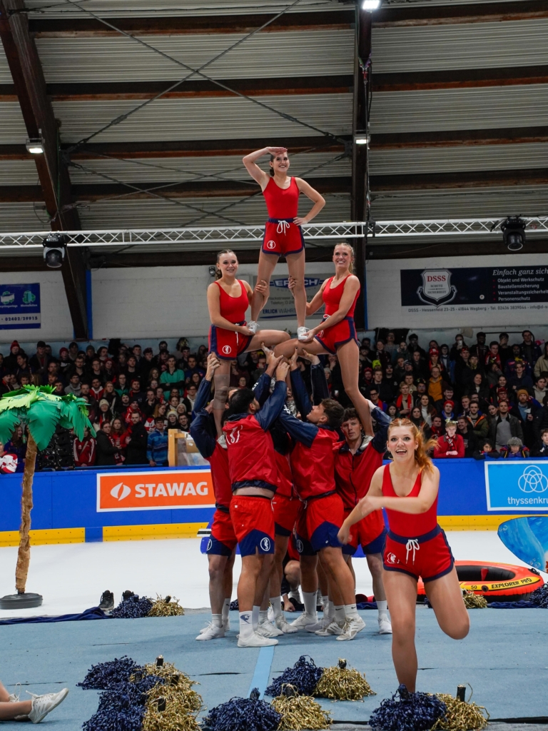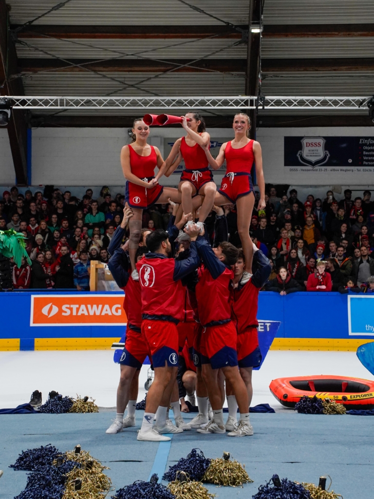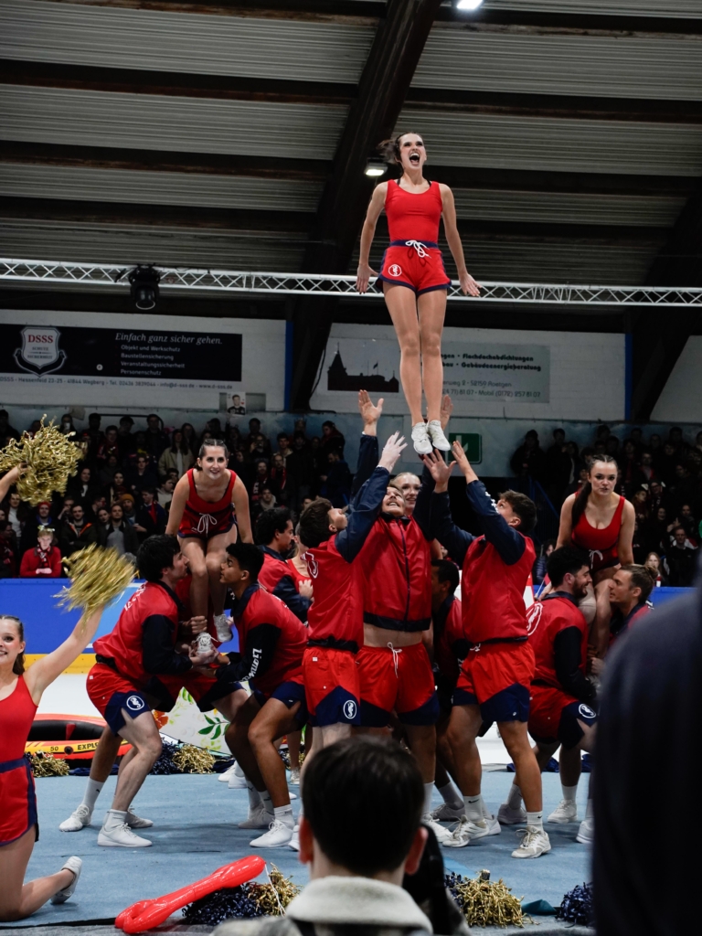 Mindestens genauso spektakulär ging es auch abseits der Partien weiter: Die Cheerleader-Teams der Fachschaften lieferten sich einen atemberaubenden Wettkampf mit einzigartigen Choreos und Figuren in schwindelerregender Höhe.